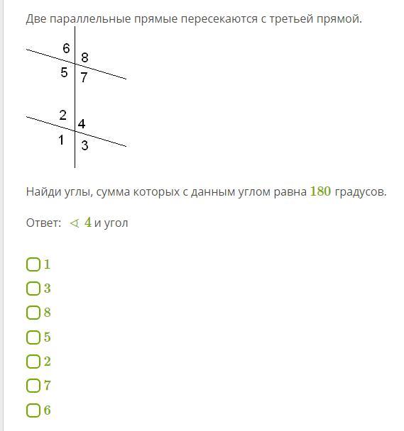 Найди углы, сумма которых с данным углом равна 180 градусов.