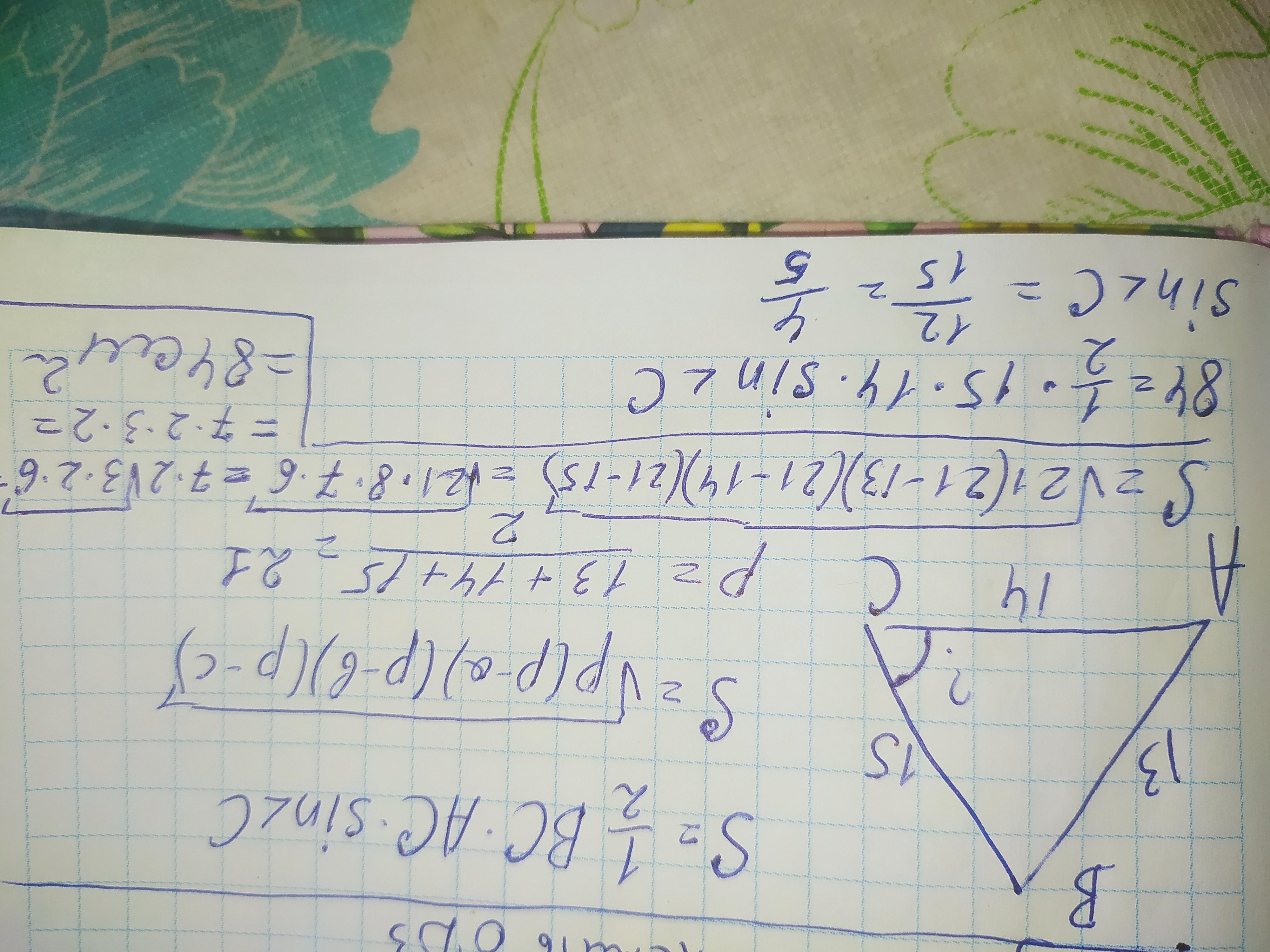 В треугольнике ABC AB = 13 см, АС= 14 см и BC= 15 см. Найди значение синуса наименьшего угла