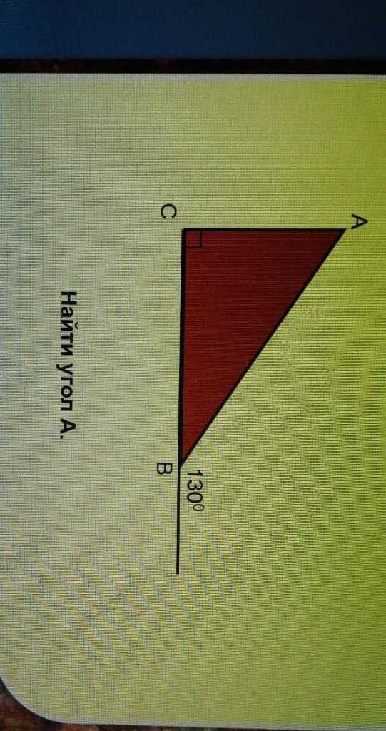 Объяснение:т.к. угол в 130 градусов смежный с углом B, то B вычисляется как 180-130 =50. угол С прямой и равен 90 градусов. Следовательно угол A равен 180 - (90 +50) = 40