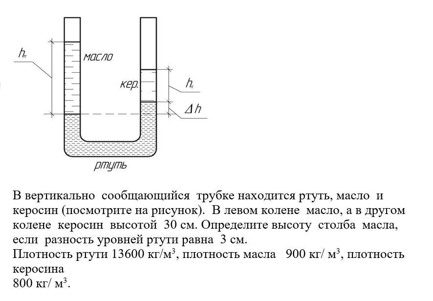 В вертикально сообщающийся трубке находится ртуть, масло и керосин (посмотрите на рисунок). В левом колене масло, а в другом колене керосин высотой 30 см. Определите высоту столба масла, если разность уровней ртути равна 3 см.