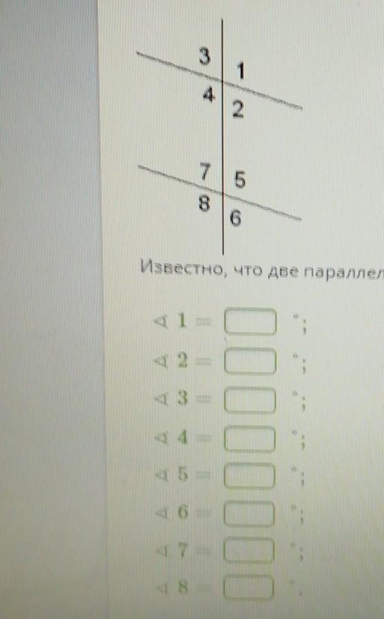 Известно, что две параллельные прямые пересекаются третьей прямой, ∢7=39°. Вычисли все углы.