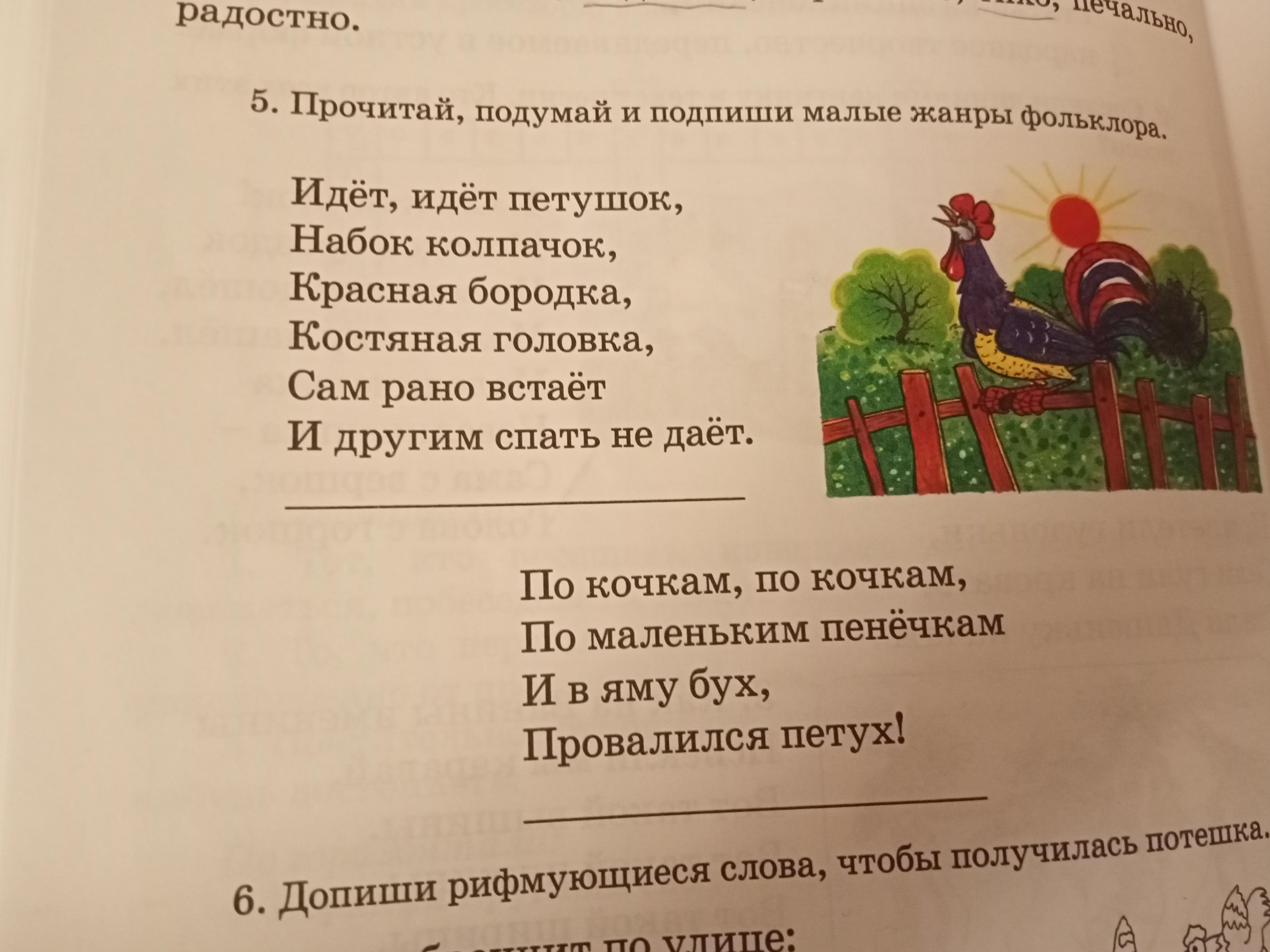Малые жанры фольклора это - пестушки (для маленьких детей няньки приговаривали), потешки (стишки, сопутствующие игре с пальцами, руками, ногами ребенка), прибаутка (короткая история), пословицы, игры, заклички, считалки, скороговорки, загадки. Мне кажется, что первое это прибаутка, а второе - потешка.