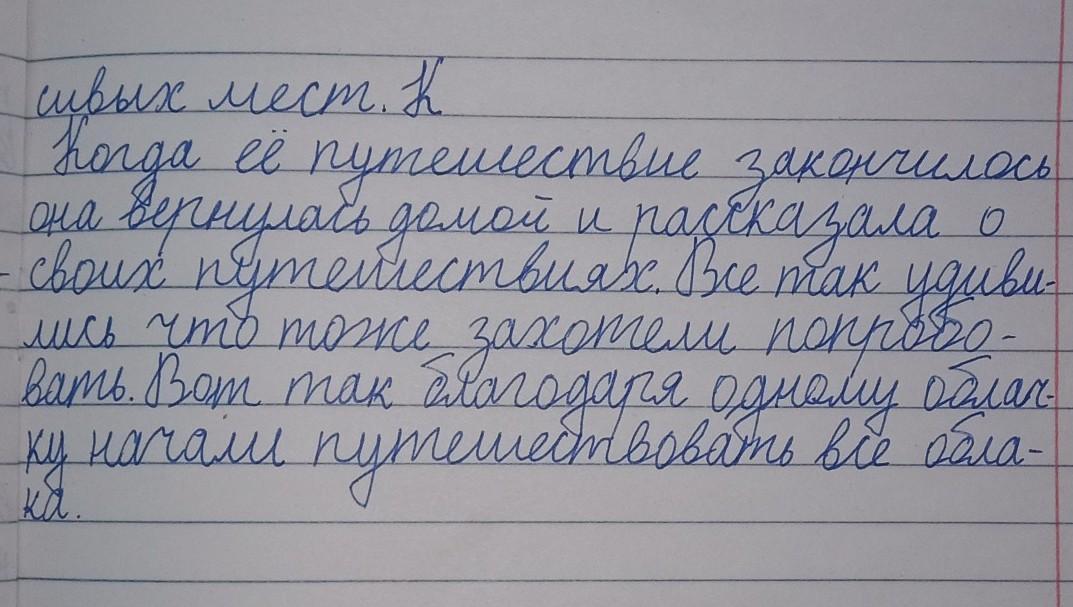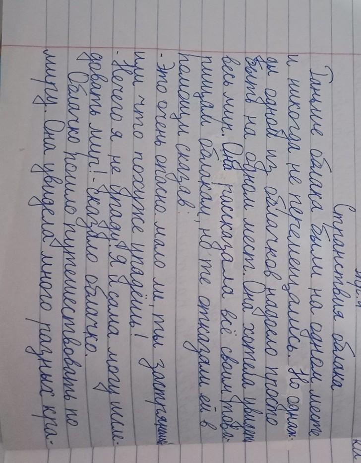 Мое любимое занятие- смотреть в раскрытое окно и наблюдать за самыми разными облаками. Вот и сейчас , я расспахнула окно и любуюсь картиной надвигающейся грозы. Тяжелые, грозовые облака сгущаются на линии горизонта. Они мрачного темно- серого цвета. Вдалеке видно еще несколько небольших светло- серых облаков, уплывающих быстро- быстро из-за сильного порывистого ветра. Слышны раскаты грома , а вот и молния, освещающая фиолетовым оттенком пышные облака. Начался дождь. Облака стали почти черного цвета, они стали словно тени преследовать друг друга, убегая за горизонт. Хорошо, что гроза была недолгой. Вот первые солнечные лучики показались через тучки. Каждое облачко становится все светлее и светлее, пропуская все большее количество солнечных лучей. Облака становятся все легче и ажурней, некоторые из них напоминают смешных , диковинных зверюшек. Вот прошел еще час и облака как бы растворились в небесной синеве