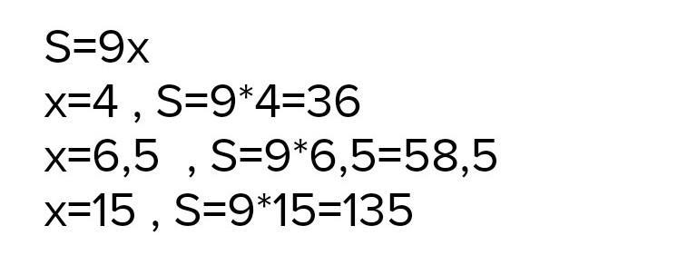 Площадь прямоугольника со сторонами 9 см и x см равна S см² Выразите формулой зависимости S от x Для значения аргумента x=4;6,5 15 найдите соответствующее значение функций S