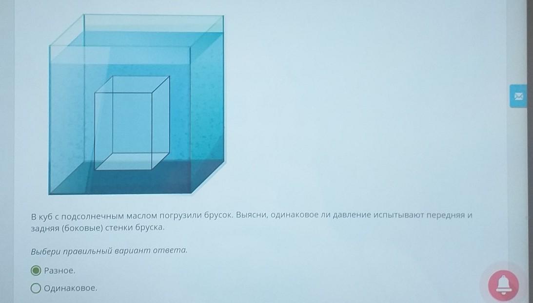 Т.к. давление зависит от высоты жидкости находящейся над бруском, следовательно боковые грани будут испытывать одинаковое давление, а нижняя грань будет испытывать большее давление, в сравнении с верхней