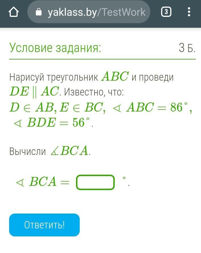 D∈AB,E∈BC, ∢ABC=86°, ∢BDE=56°.