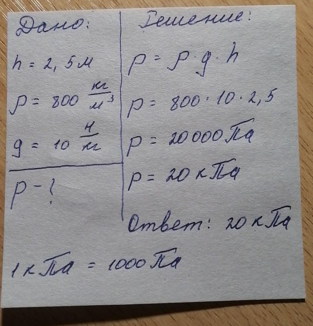 Чему равно давление в цистерне наполненной нефтью ,на глубине 2.5 м. плотность нефти 800 кг/м3, принять g = 10H/кг