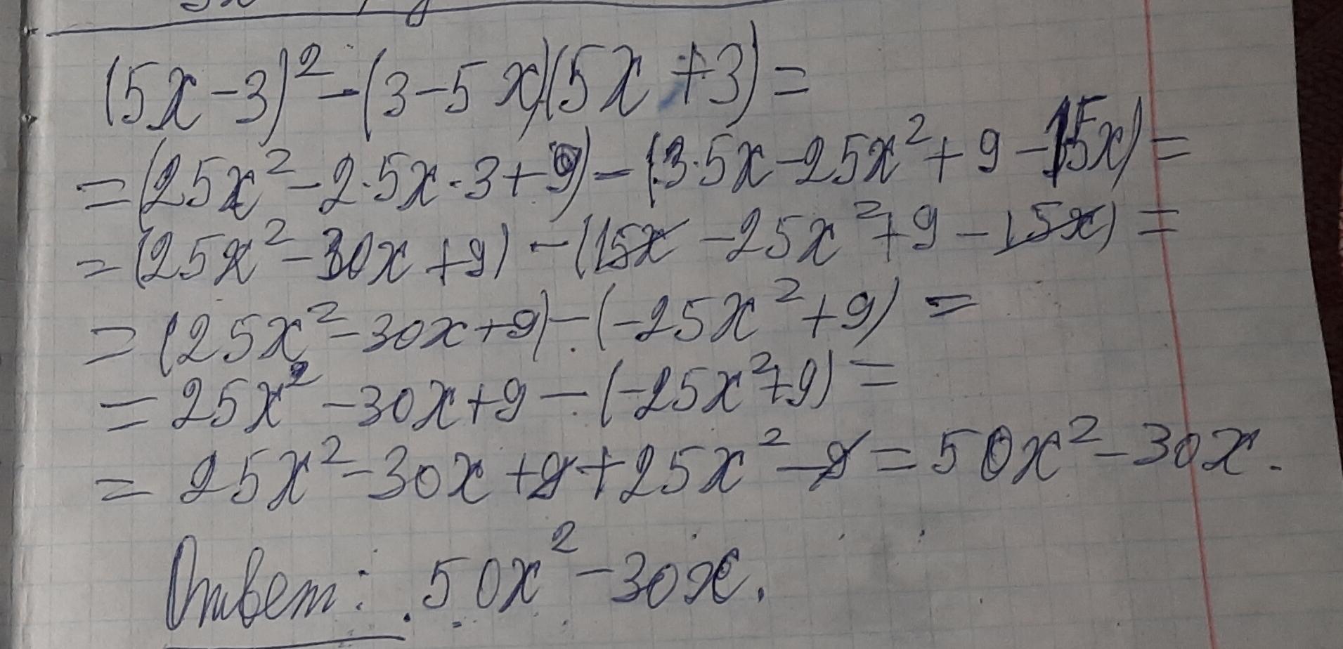 (5х-3)²+(5х-3)(5х+3)=(5х-3)²+25х²-9= 25х²-30х+9+25х²-9=50х²-30х