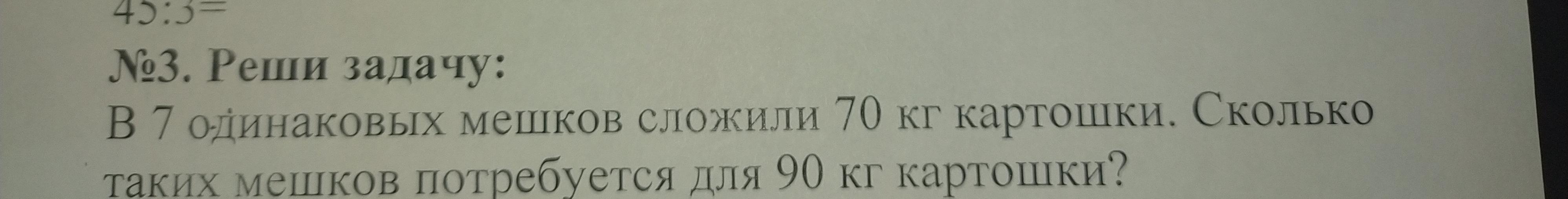 Помогите заполнить чертеж к задаче в фото. Задача:В 7 одинаковых мешков сложили 70 кг картошки. Сколько таких мешков потребуется для 90 кг картошки?.