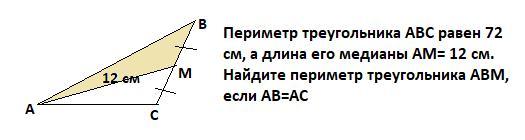 Периметр треугольника ABC равен 72 см, а длина его медианы AM= 12 см. Найдите периметр треугольника ABM, если AB=AC