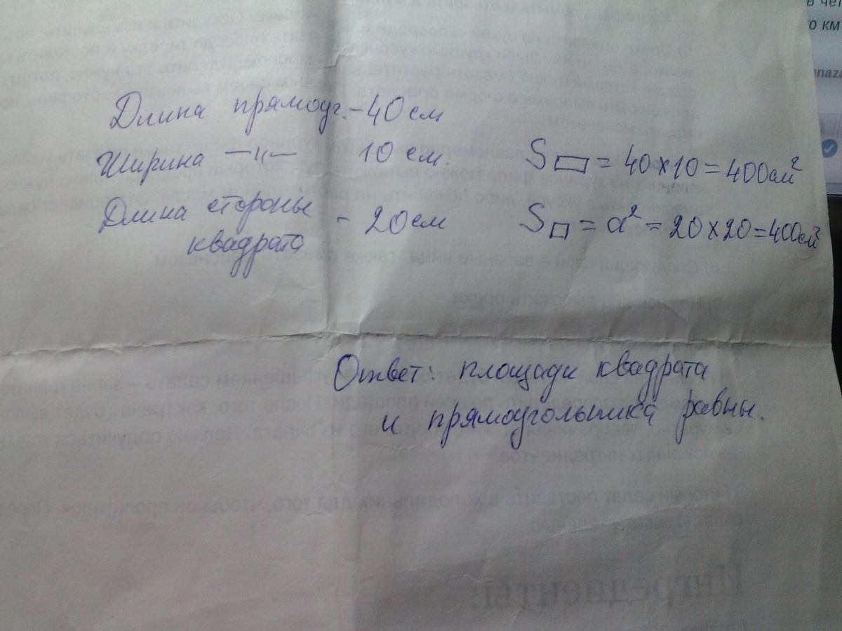 сравни площади прямоугольника и квадрата, если длины сторон прямоугольника 40 см и 10 см, а длина стороны 20 см.