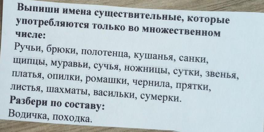 Ручьи,полотенца,муравьи,сутки,звенья,платья,опилки,ромашки,листья,васильки,сумерки.