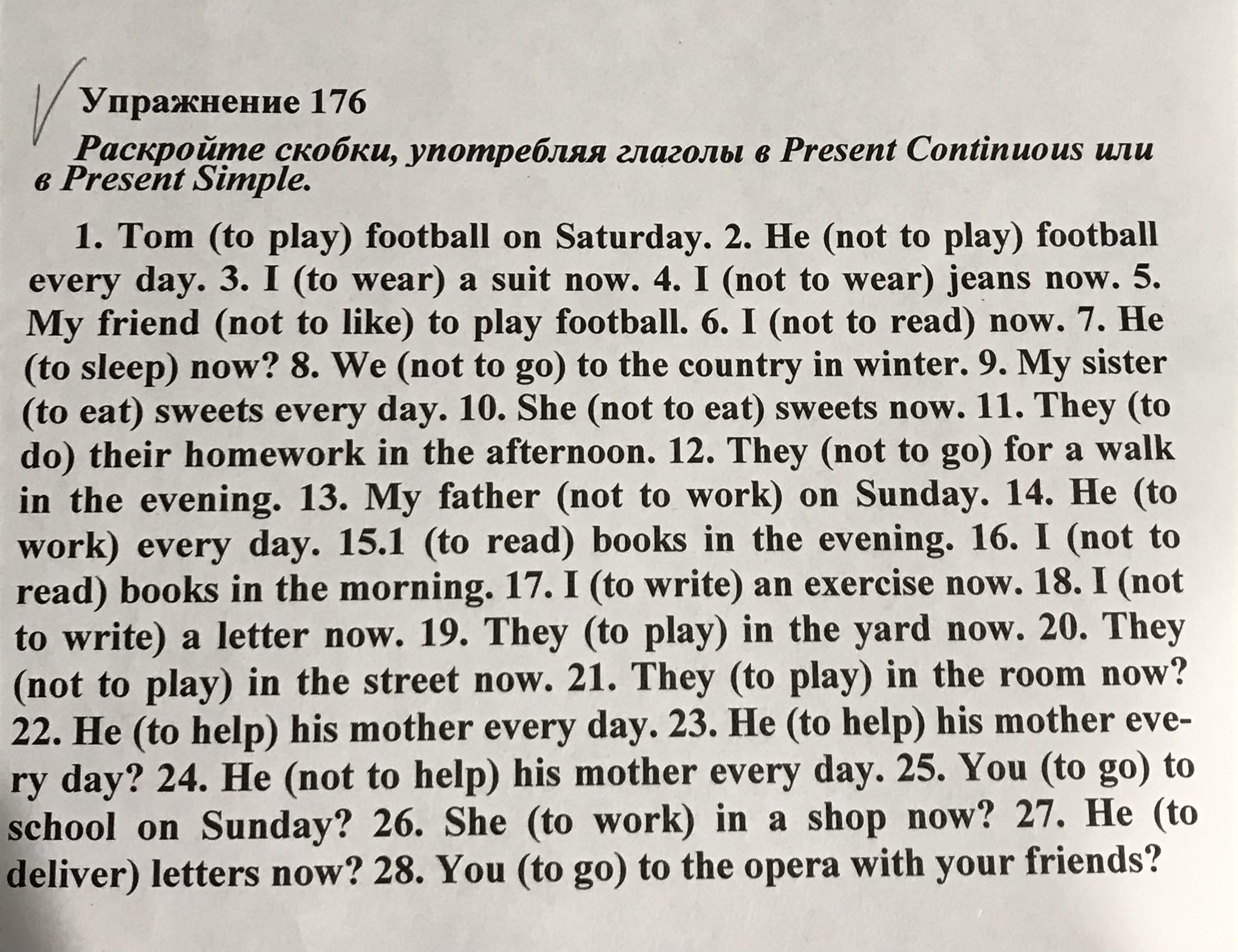 Tom plays football on Saturday. 2. He doesn't play football every day. 3. I am wearing a suit now. 4. I am not wearing jeans now. 5. My friend doesn't like to play football. 6. I am not reading now. 7. Is he sleeping now? 8. We don't go to the country in winter. 9. My sister eats sweets every day. 10. She isn't eating sweets now. 11. They do their homework in the afternoon. 12. They don't go for a walk every day. 13. My father doesn't work on Sunday. 14. He works every day. 15. I read books in the evening 16. I don't read books in the morning 17. I am writing an exercise now. 18. I am not writing a letter now. 19. They are playing in the yard now. 20. They aren't playing in the street now. 21. Are they playing in the room now? 22. He helps his mother every day. 23. Does he help his mother every day? 24. He doesn't help his mother every day. 25. Do you go to school on Sunday? 26. Is she working in a shop now? 27. Is he delivering letters now? 28. Do you go to opera with your friends?