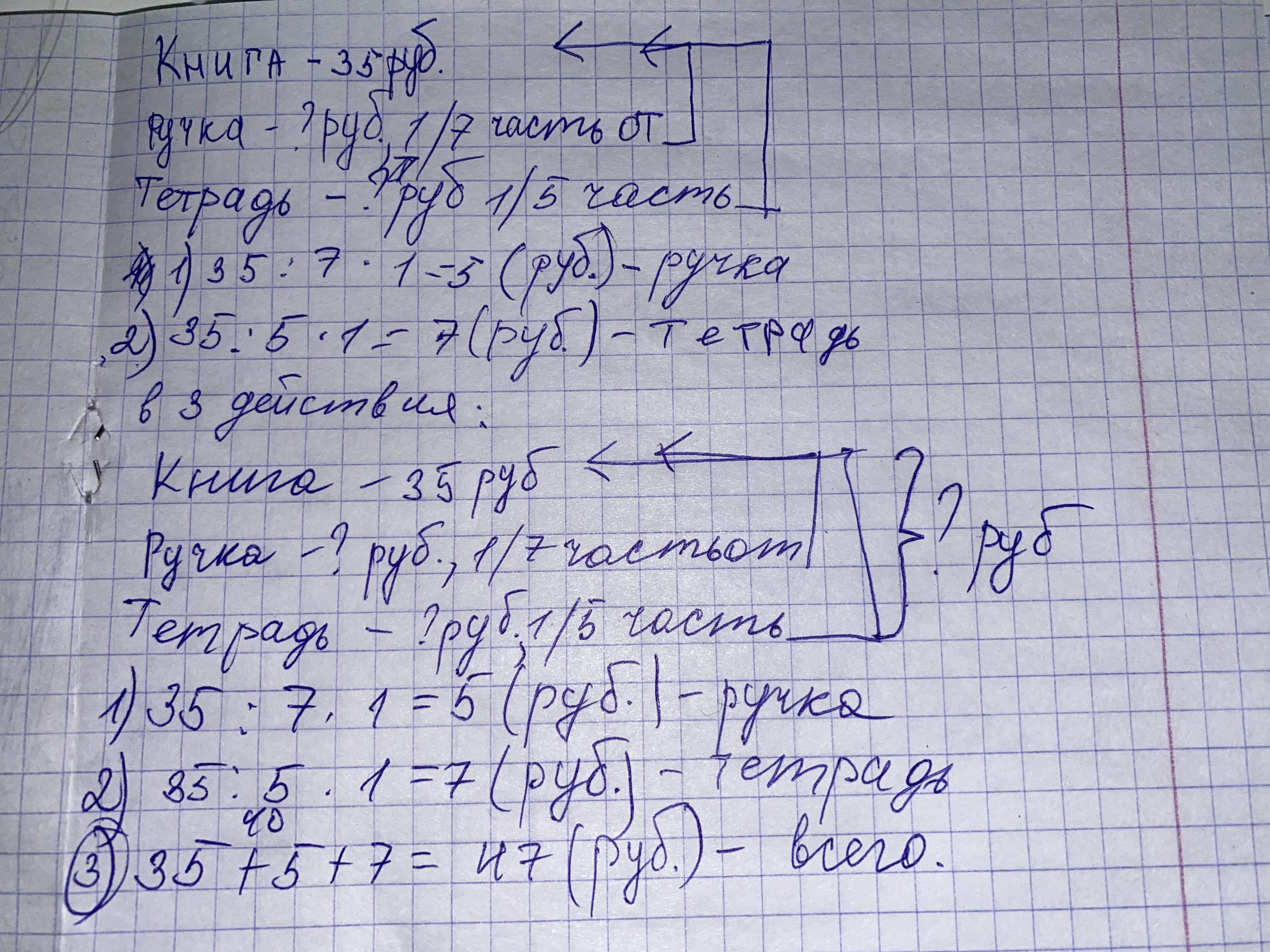 книга Стоит 35 руб. Цена ручки составляет седьмую часть цены книги, а цена тетради – пятую часть книги. Сколько рублей стоит ручка и сколько – тетрадь? Измени вопрос задачи так, чтобы она решалась в три действия. Реши новую задачу