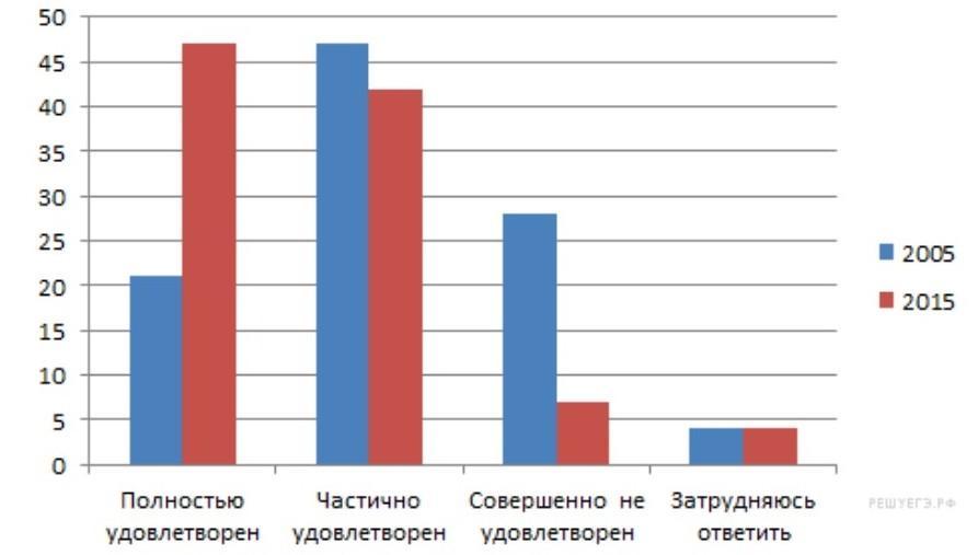 В стране Z в 2005 и 2015 гг. были проведены опросы общественного мнения среди городской молодёжи, в ходе которых респондентам предлагалось ответить на вопрос: «Удовлетворены ли Вы образованием, которое получили или получаете в настоящее время?» Результаты опроса (в % от числа отвечавших) представлены в диаграмме.
