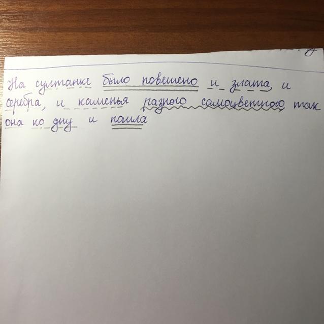 помогите разобрать предложение: на султанке было повешено и злата и серебра и каменья разного самоцветного, так она ко дну и пошла.