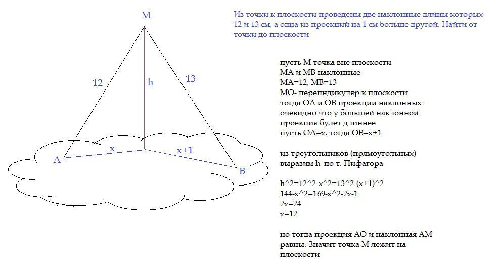 Из точки к плоскости проведены две наклонные длины которых 12 и 13 см, а одна из проекций на 1 см больше другой. Найти от точки до плоскости