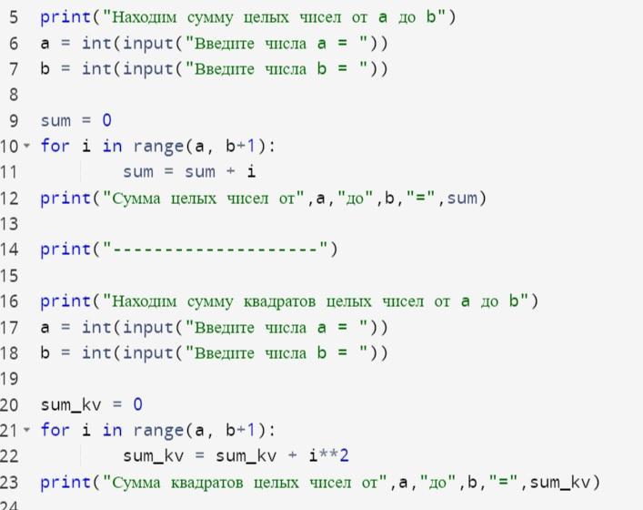 b) сумму квадратов целых чисел от a до b (a b).