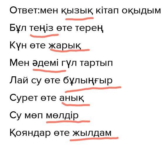Ответ:қызықты,теңізде,жарықты,әдемілеу,бұлыңғырлау,анықты,мөлдірлеу,жылдамдау