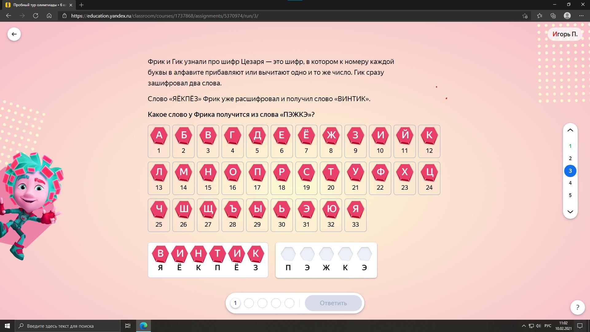 Слово «ЯЁКПЁЗ» Фрик уже расшифровал и получил слово «ВИНТИК».