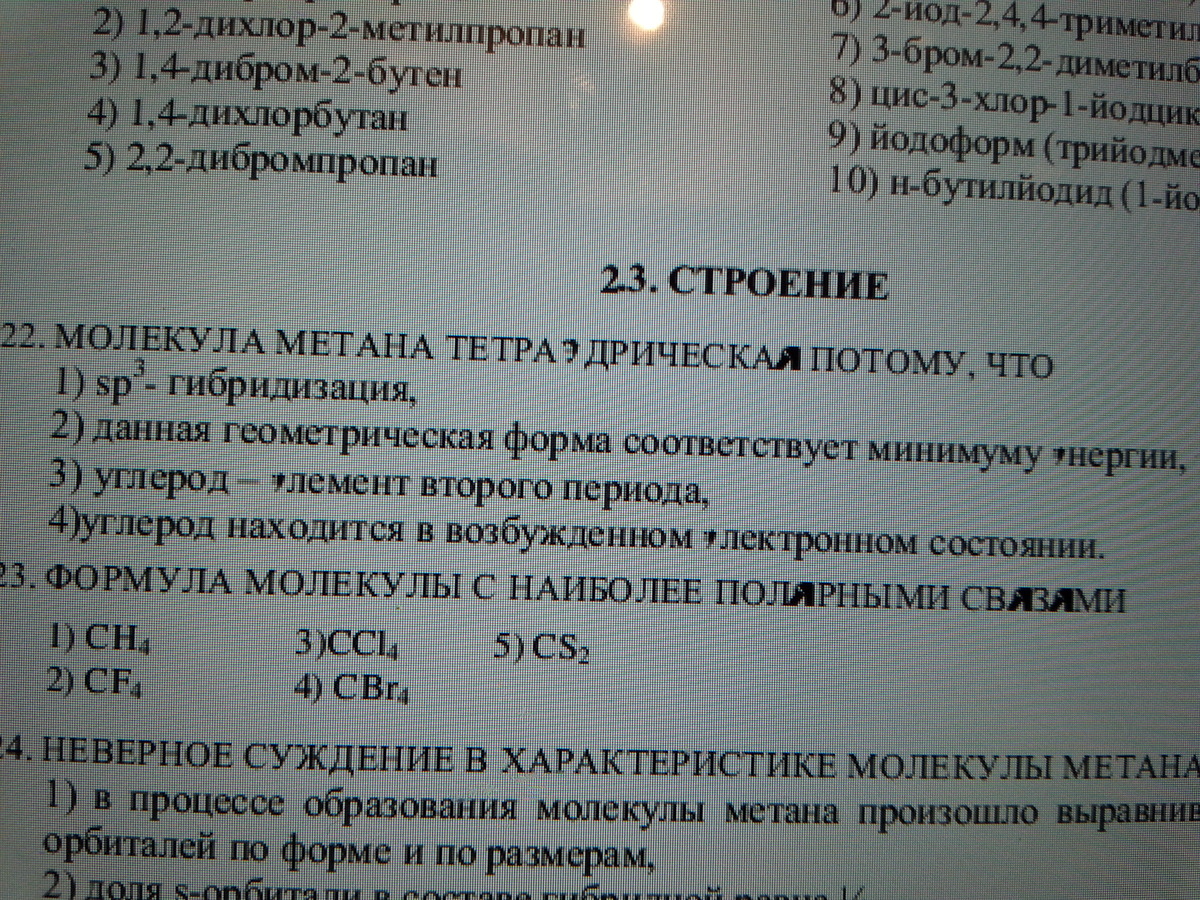 При гибридизации электронных облаков в атоме углерода из одной s-орбитали и трех р-орбиталей образуются четыре одинаковые гибридные sp3-орбитали. Гибридные орбитали направлены к вершинам тетраэдра, и при образовании ковалентных связей эти связи также оказываются направлены к вершинам тетраэдра. Поэтому молекула метана имеет тетраэдрическую форму.