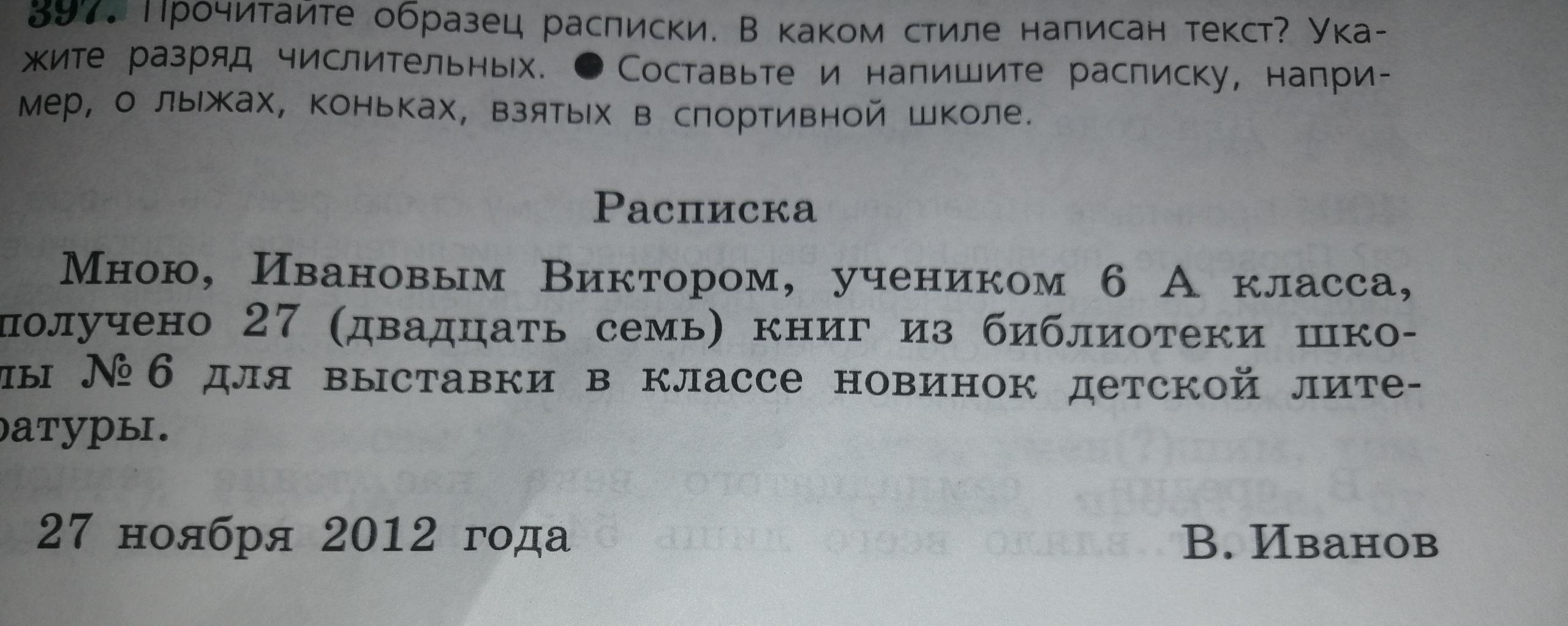 Мною, (твои полные имя и фамилия, или, если не хочешь об этом писать, то вот, подкину идею) Пòлиной Екатериной, ученицей (твой класс, или, если тут тоже не хочешь писать об этом, то вот, еще одна идея) 6 Б класса, получена 1 (одна) пара лыж из спортивной школы N9 для участия в детском горнолыжном соревновании в той же спортивной школе.