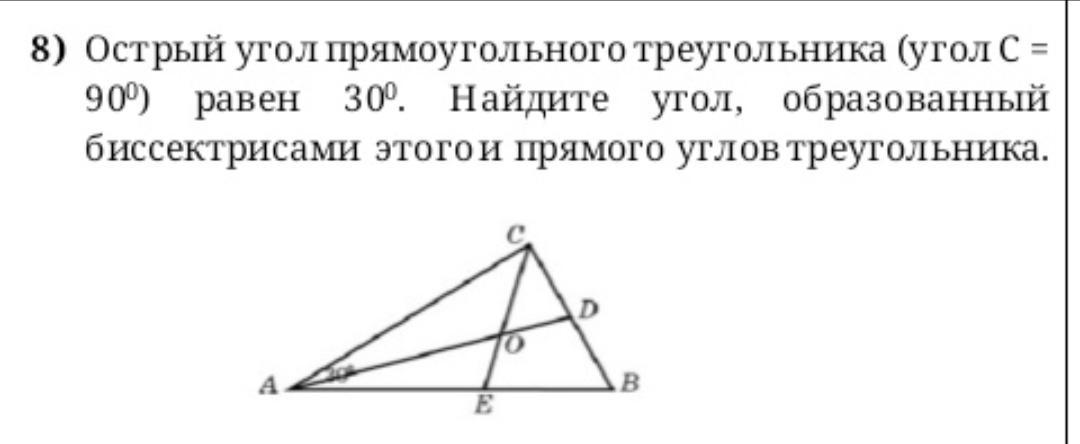 Острый угол прямоугольного треугольника (угол С=90°) равен 30 °. Найдите угол, образованный биссектрисами этого и прямого углов треугольника. Дам 70 баллов за подробный ответ!