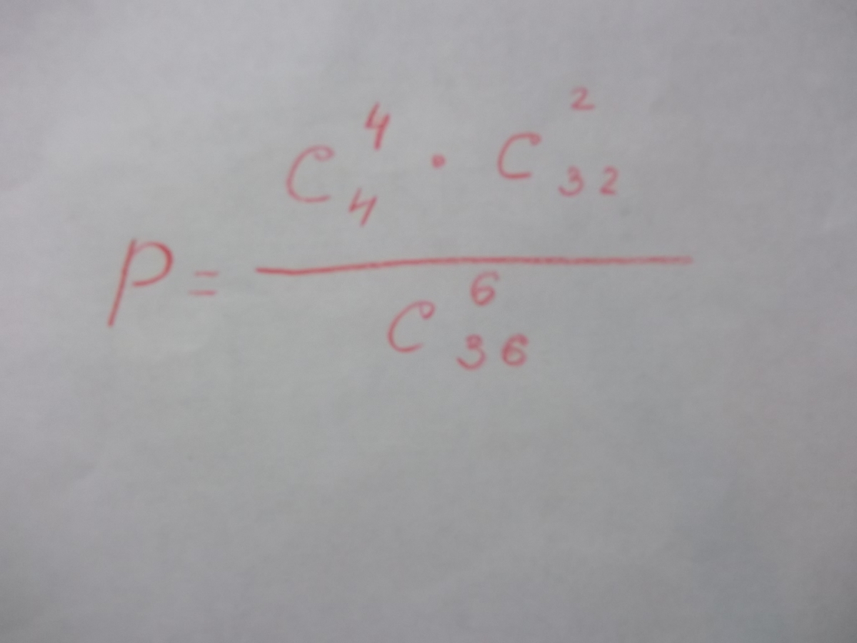 frac{C _{32} ^{2}  }{C _{36}  ^{6} } = frac{32!}{2!30!} frac{30!6!}{36!}  = frac{3*4*5*6}{33*34*35*36}= frac{1}{3927}