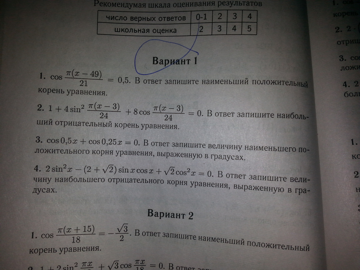 3. cos(2*x/4)+cos(x/4)=0; 2cos^2(x/4)-1+cos(x/4)=0; 2cos^2(x/4) + cos(x/4) -1=0; a)cos(x/4)=1/2; x/4=+-pi/3+2pik; x=+-4pi/3 +8pik; б) cos(x/4)=-1; x/4=pi+2pik; x=4pi+8pik. наименьший положительный корень х=4pi/3=4*180/3=240градусов.