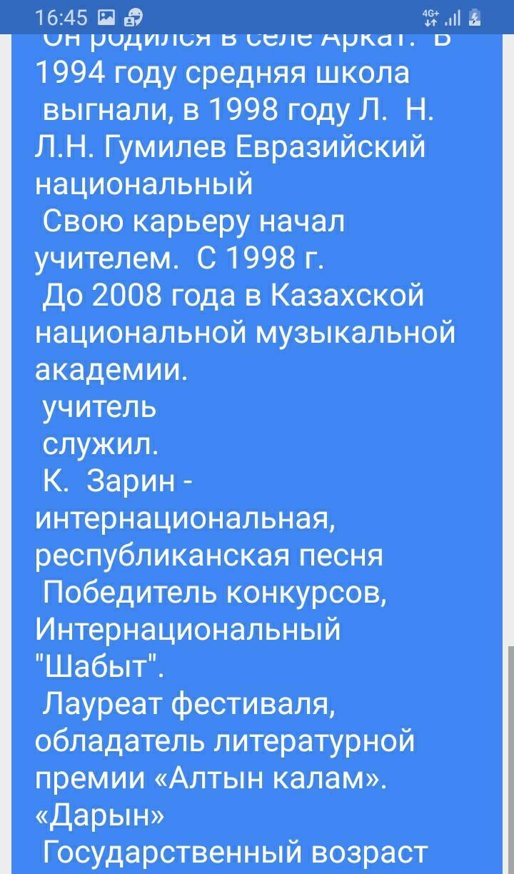 Лауреат фестиваля, обладатель литературной премии «Алтын калам». «Дарын»