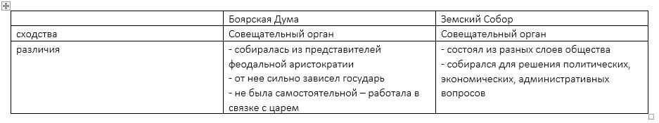 Таблица сравнения Боярской Думы и Земского собора ниже