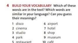 words are in the text? Which words are similar in your language? Can you guess their meanings? 1 disco 6 airport 2 cinema 7 hotel 3 studio 8 shop 4 park 9 museum 5 restaurant 10 café