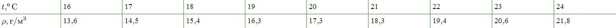В закрытом сосуде вместимостью 5 л находится ненасыщенный водяной пар массой 103 мг. При какой температуре пар будет насыщенным? Таблица плотности насыщенных паров воды приведена ниже.