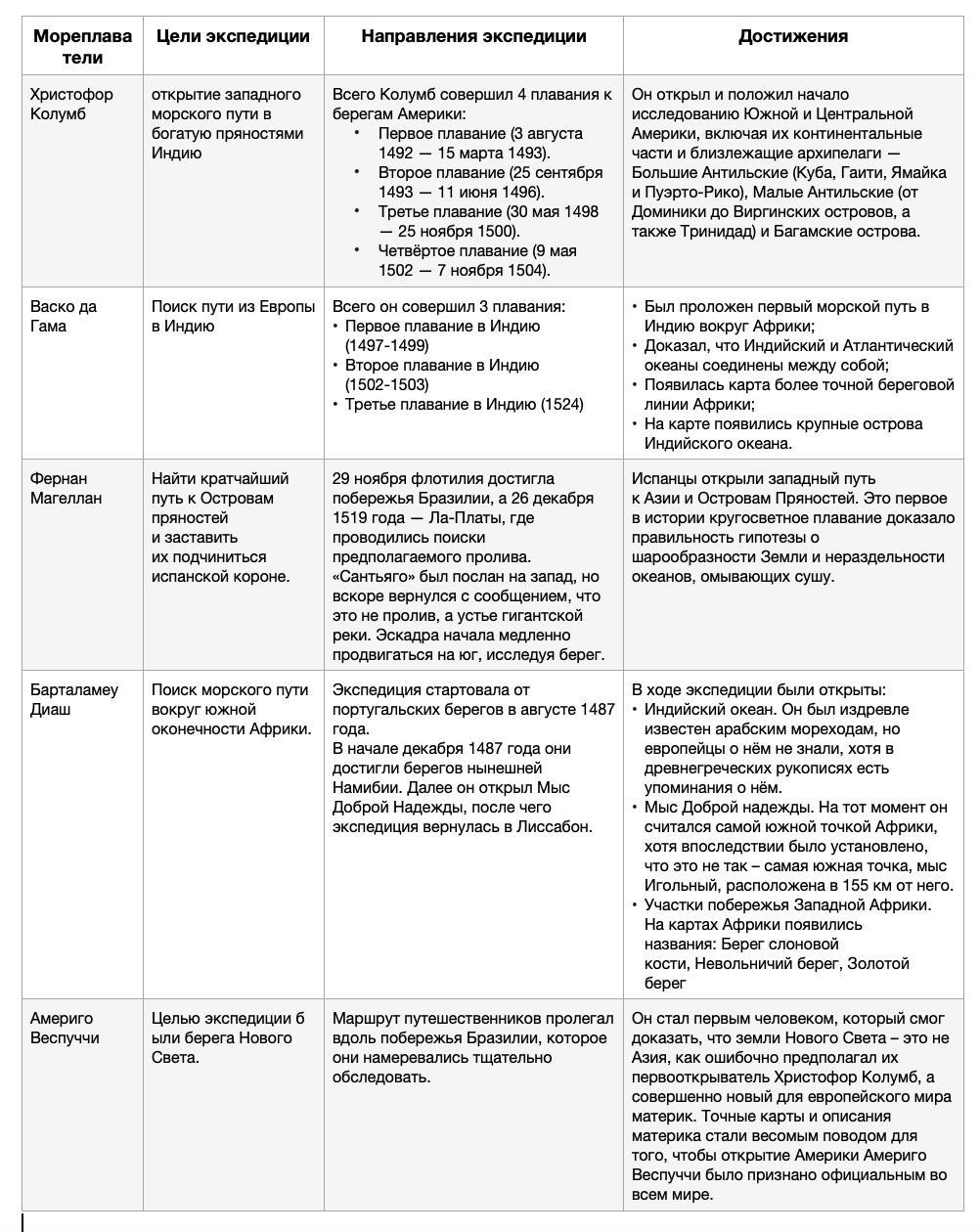 Таблицу по целям, направлениям и достижениям экспедиций Христофора Колумба, Васко да Гама, Фернана Магеллана, Барталамеу Диаша и Америго Веспуччи можно заполнить по примеру ниже.