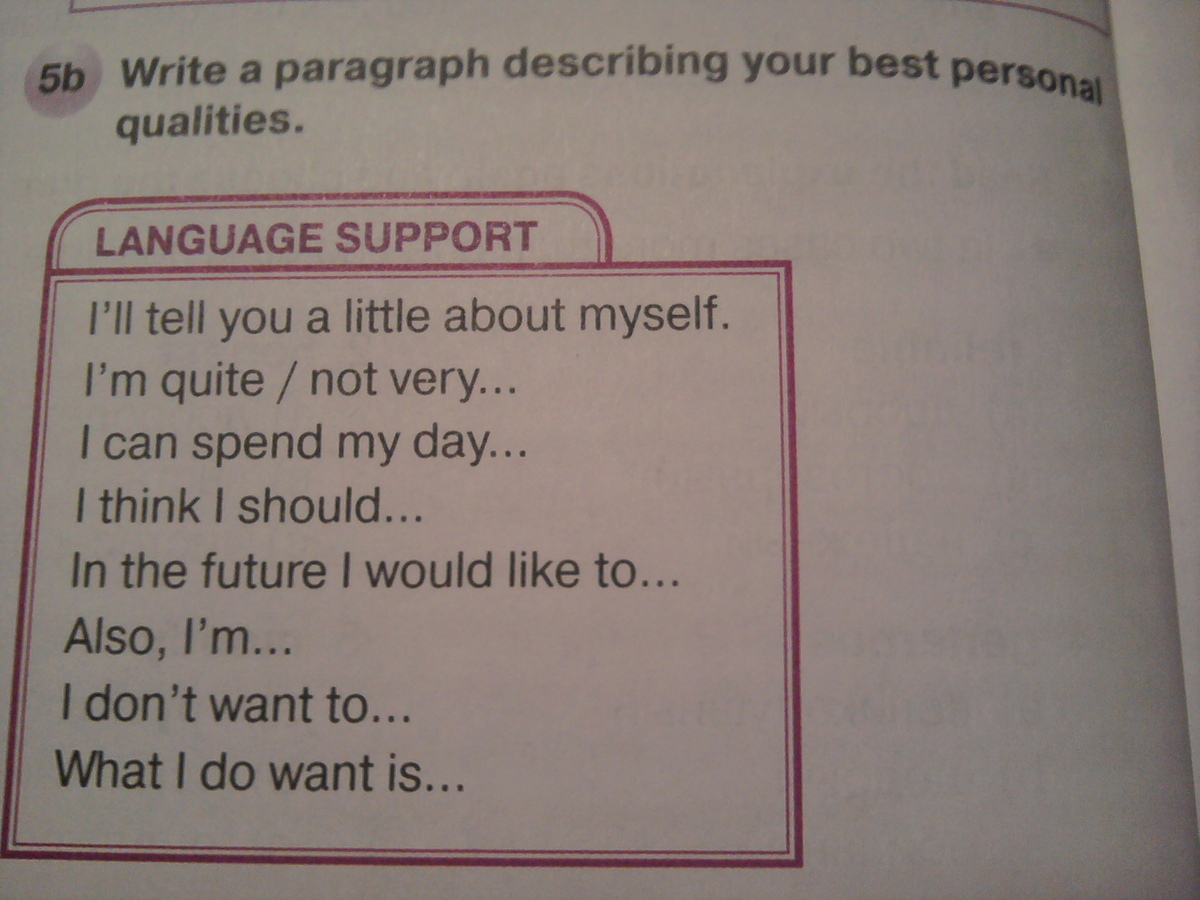 I'll tell you a littel about myself. I'm 14 years old. I like animals and I have a dog, a cat, and a perrot. My hobbies is boxing, play chess and theater art. I like to walk, listen to music and sport