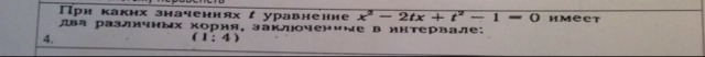 в начале свернем квадрат разности и перенесем 1 : (x-t)2 = 1; после вычислим кв корень : x-t = 1 и x-t = -1; выразим t : (1) t=x-1 и (2) t=x+1 ; => t не равно x и при этом лежит в интервале (1) 0 < t < 3 и (2) 1 < t < 5, находим объединение и получаем 1 < t < 3