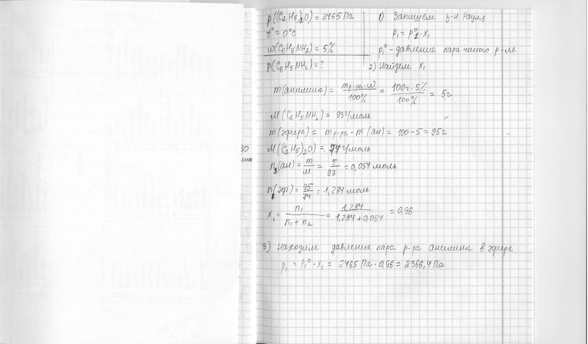При 0°С давление пара эфира (С2Н5)2О составляет 2465 Па .Найдите для той же температуры давление пара 5%-ного раствора анилина С6Н5NH2.