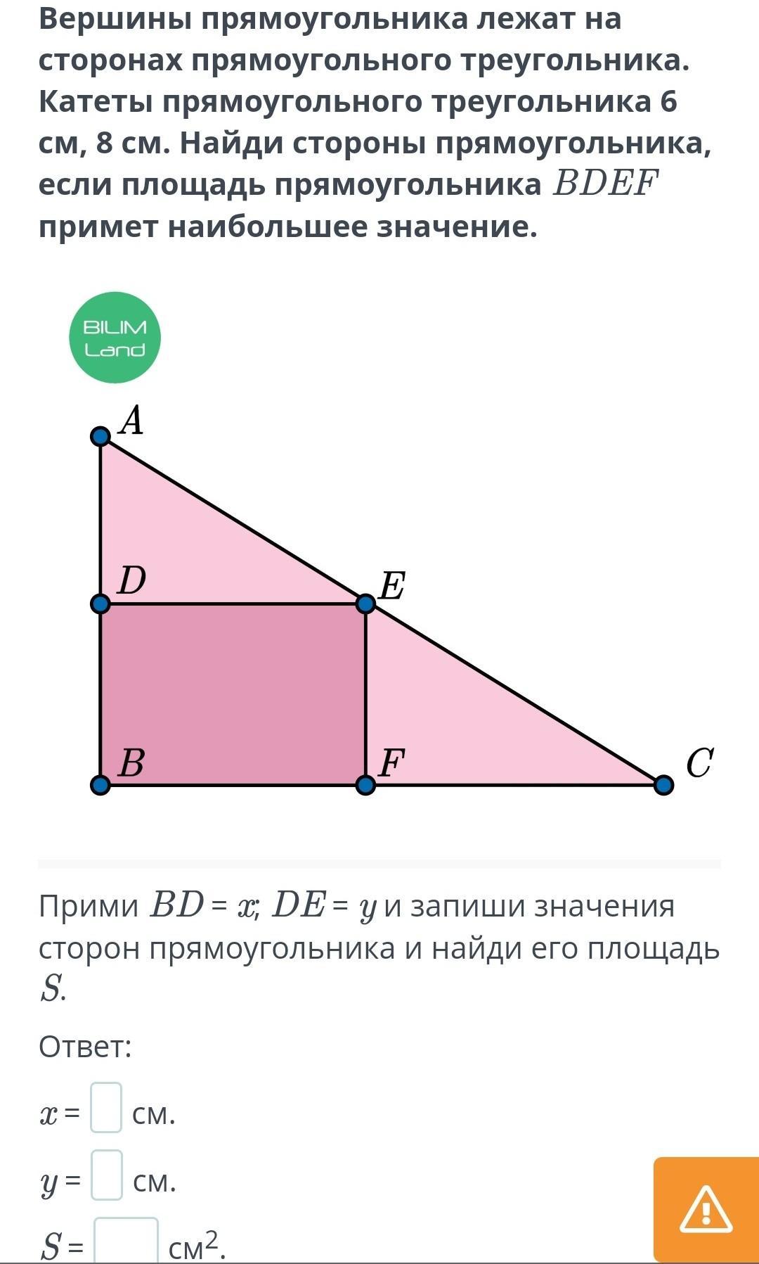 Вершины прямоугольника лежат на сторонах прямоугольного треугольника. Катеты прямоугольного треугольника 6 см, 8 см. Найди стороны прямоугольника, если площадь прямоугольника BDEF примет наибольшее значение.