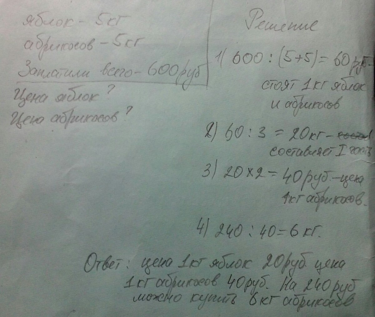 за 5 кг яблок и 5 кг абрикосов заплатили 600 рублей Абрикосы в 2 раза дороже яблок.Сколько килограммов абрикосов можно купить на 240 рублей?построй схему с помощью которой можно определить цену абрикосов и цену яблок.