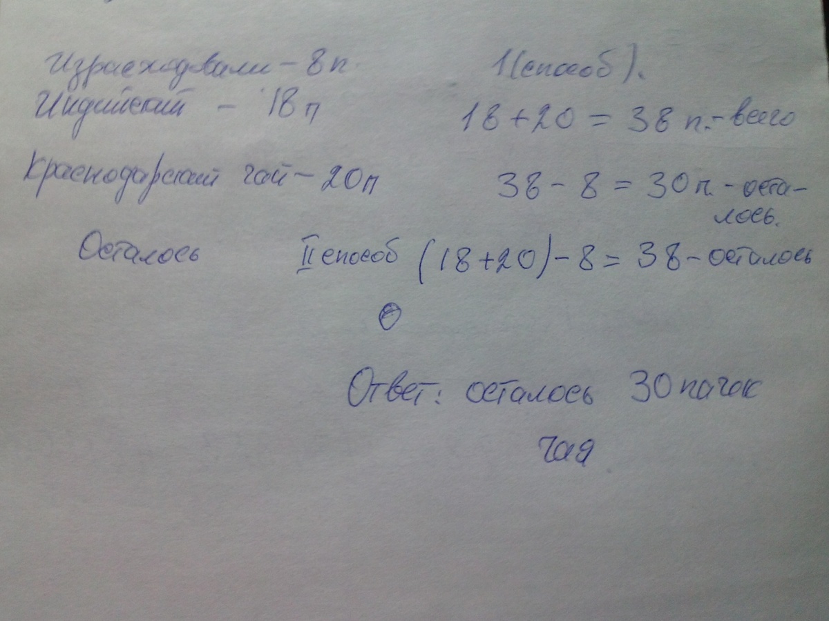 для школьного буфета купили 18 пачек индийскоко чая и 20 пачек краснодарского.Израсходовали 8 пачек.Сколько пачек чая осталось?Вставь пропущеные числа и запиши что узнаешь в каждом действии решая задачу разными способами