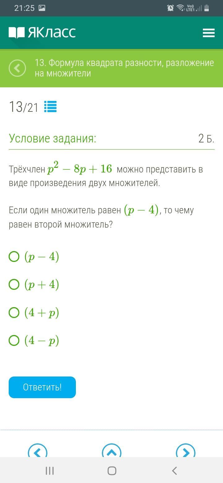 3) Надо трехчлен разделить на (p-4). Получим (p-4). Значит ответ 1