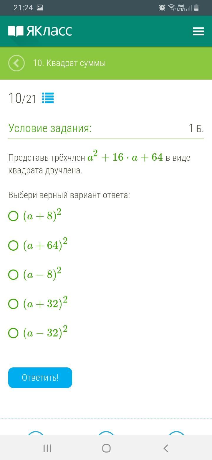 1) a^2+2*8 a +64=(a+8)^2 Ответ 1