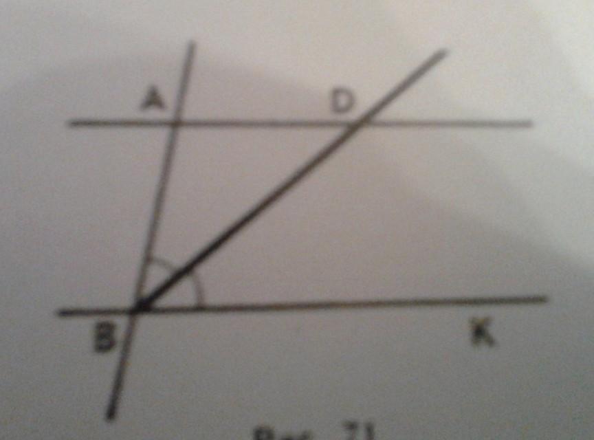 На рисунке 71 прямые AD и BK параллельны луч BD биссектриса угла ABK. угол АBK=80 градусов. Найдите углы треугольника ABD
