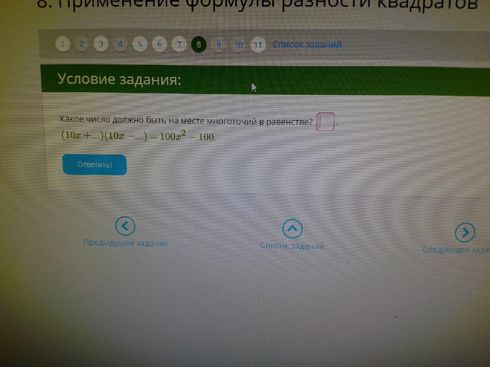 Так как 100х²-100=(10х-10)(10х+10),то вместо многоточий должно быть числ 10;