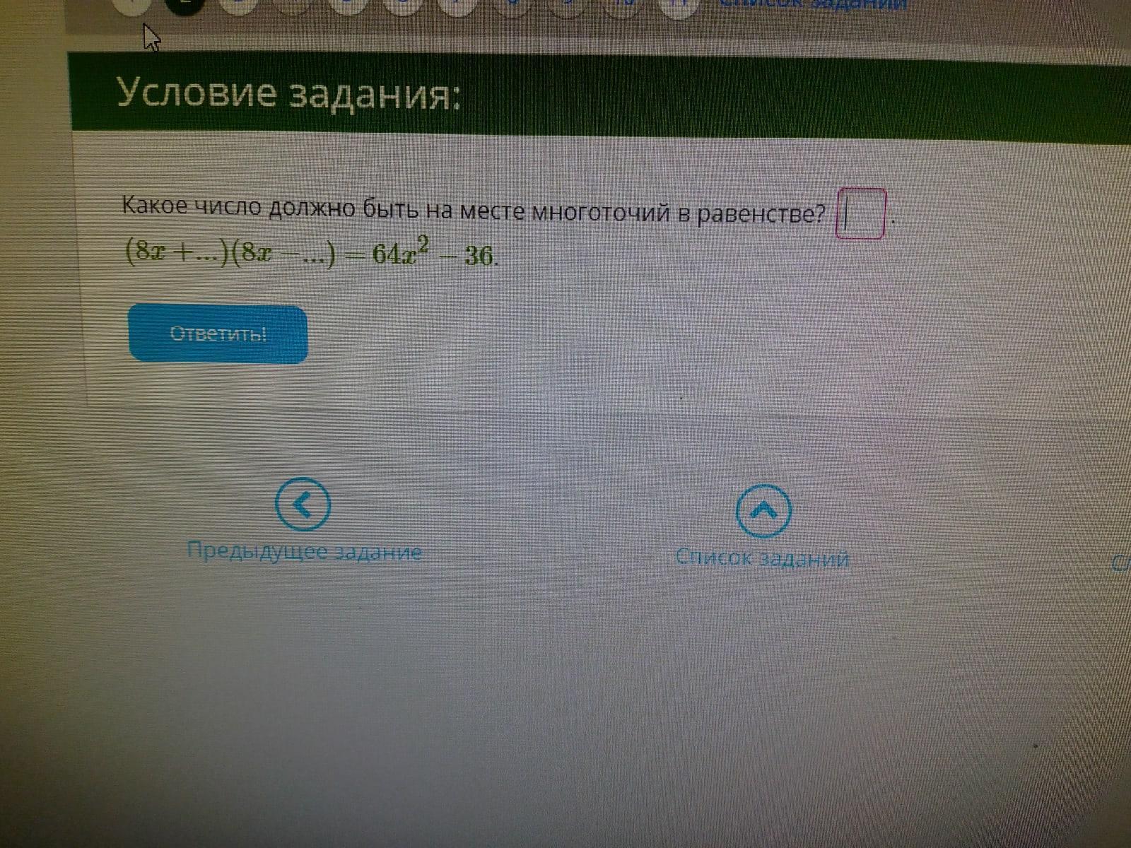 Так как 64х²-36=(8х-6)(8х+6),то вместо многоточий должно быть числ 6;
