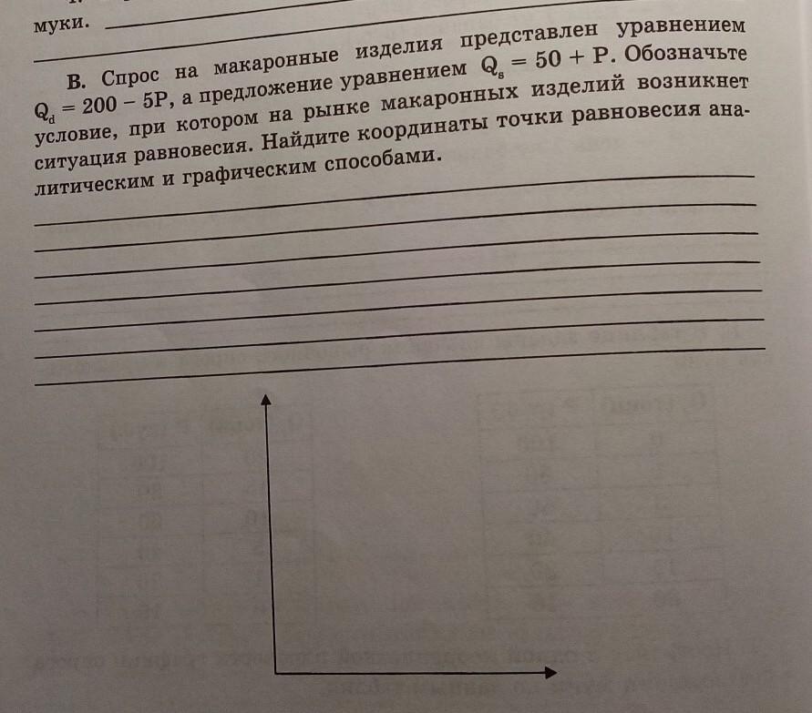 Спрос на макаронные изделия представлен уравнением Qd=200-5P, а предложение уравнением Qs=50+P. Обозначьте условие, при котором на рынке макаронных изделий возникнет ситуация равновесия. Найдите координаты точки равновесия аналитическим и графическим способами. Решите задачу по экономике, пожалуйста