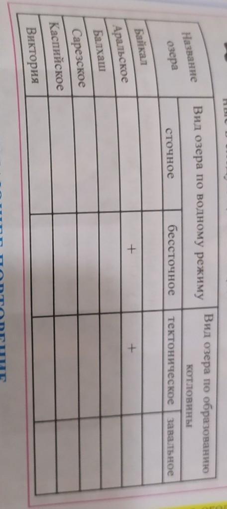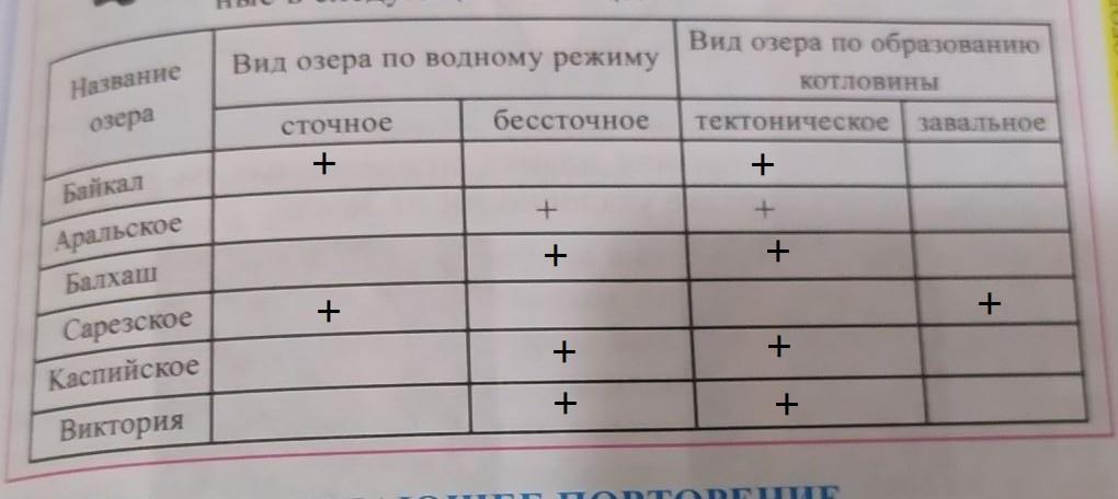 Определите к каким видам относятся озёра приведённые в следующей таблице
