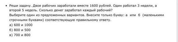 Ответ:1600 делим на 8 , так как это суммарно отработанные недели за тем умножаем полученное (200) на 3 (600 заработал 1й рабочий ) и 200 умножаем на 5 = 1000 (заработал 2й рабочий)