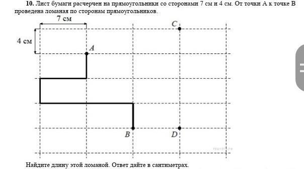 Лист бумаги расчерчен на прямоугольники со сторонами 7см и 4 см. от точки А к точке В проведена ломаная по сторонам прямоугольников.