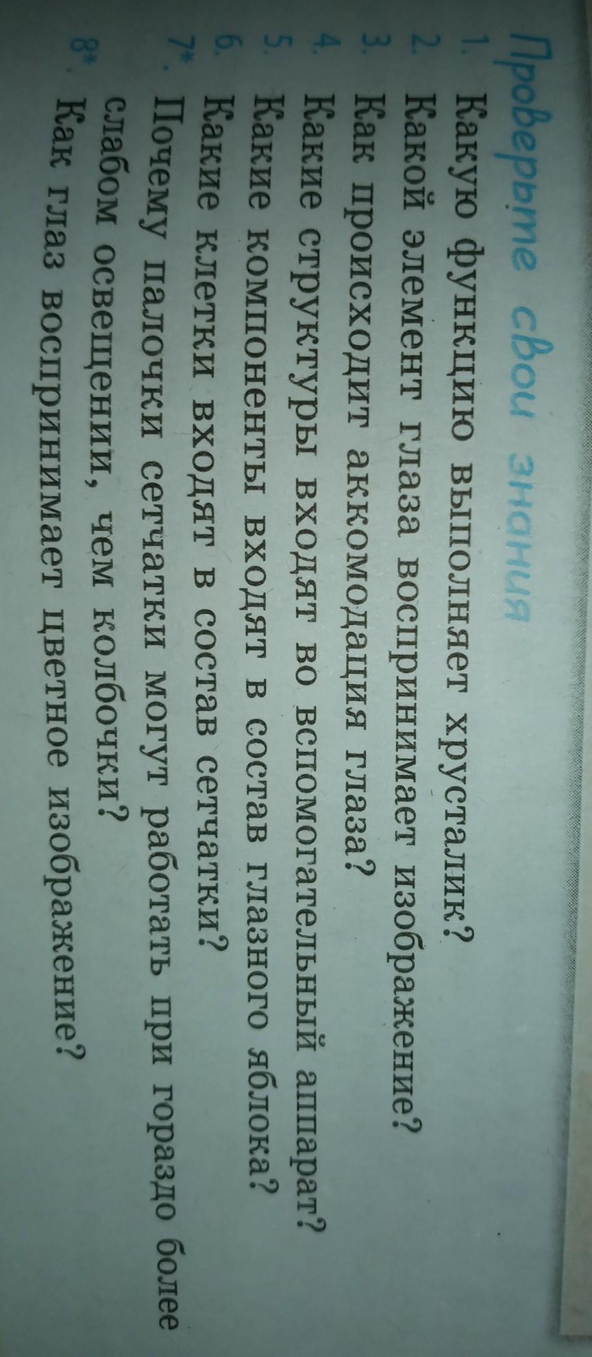 8. Цвет воспринимается зрительной системой (сетчаткой) в условиях достаточной освещённости, необходимой для работы рецепторов-колбочек. Светочувствительные колбочки в ответ на попадание фотонов в глаз стимулируют нервные импульсы, поступающие в мозг, причем импульсы из правого глаза идут в левое полушарие мозга, и наоборот. На счет этого вопроса можешь дополнительно написать мне, если что-то не ясно.